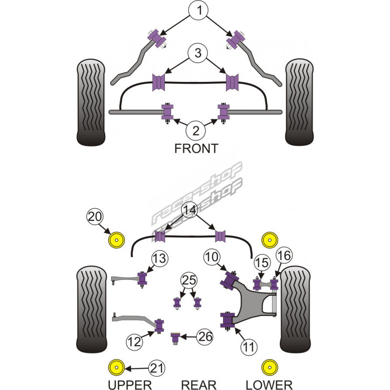 Violet 80A - najkorišteniji materijal. Koristi se u većini područja ovjesa i pruža pravu kombinaciju performansi i usklađenosti.