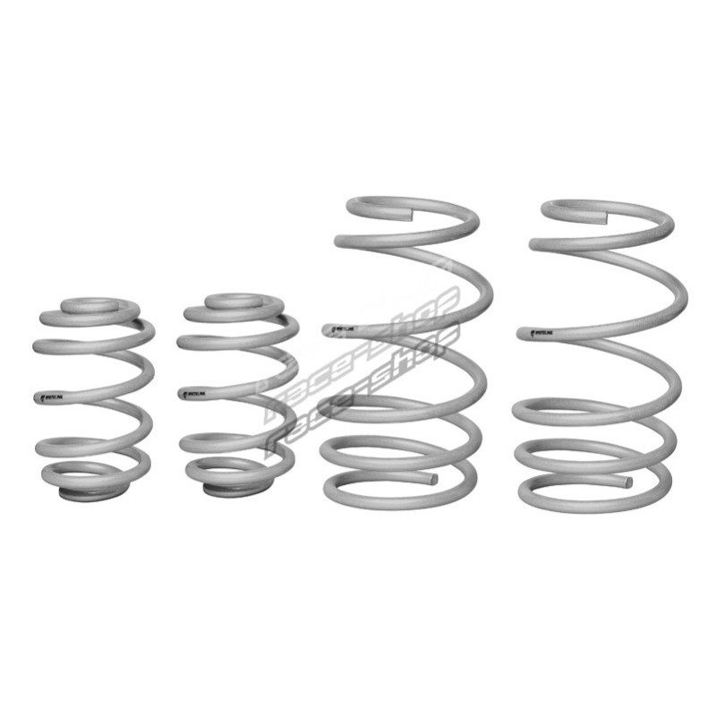 Whiteline Springs deliver improved vehicle performance whilst maintaining safety and ride quality characteristics. This kit contains 3.5kg/mm (196lb/in) front rated springs that provide a 25mm drop while the 5.7kg/mm (319lb/in) rated rears deliver a desirable 25mm to the vehicle. By lowering the vehicles centre of gravity, the unique and progressive rate coil design not only improve performance but enhance overall appearance. Developed and manufactured in Europe from the highest quality materials, coating and to the finest tolerances guaranteeing exact fitment. Whiteline Springs are engineered for optimal balance with OEM and aftermarket shocks. For total grip activation match with Whiteline Sway Bar and Essentials kit for unrivalled handling and optimal vehicle performance.